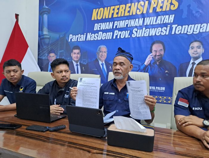 Pengumuman pergantian Ketua DPRD Sultra dan Ketua Fraksi NasDem disampaikan Sekretaris DPW Partai NasDem Sultra Tahir Kimi dalam jumpa media di Kantor NasDem, Rabu (26/11/2025).