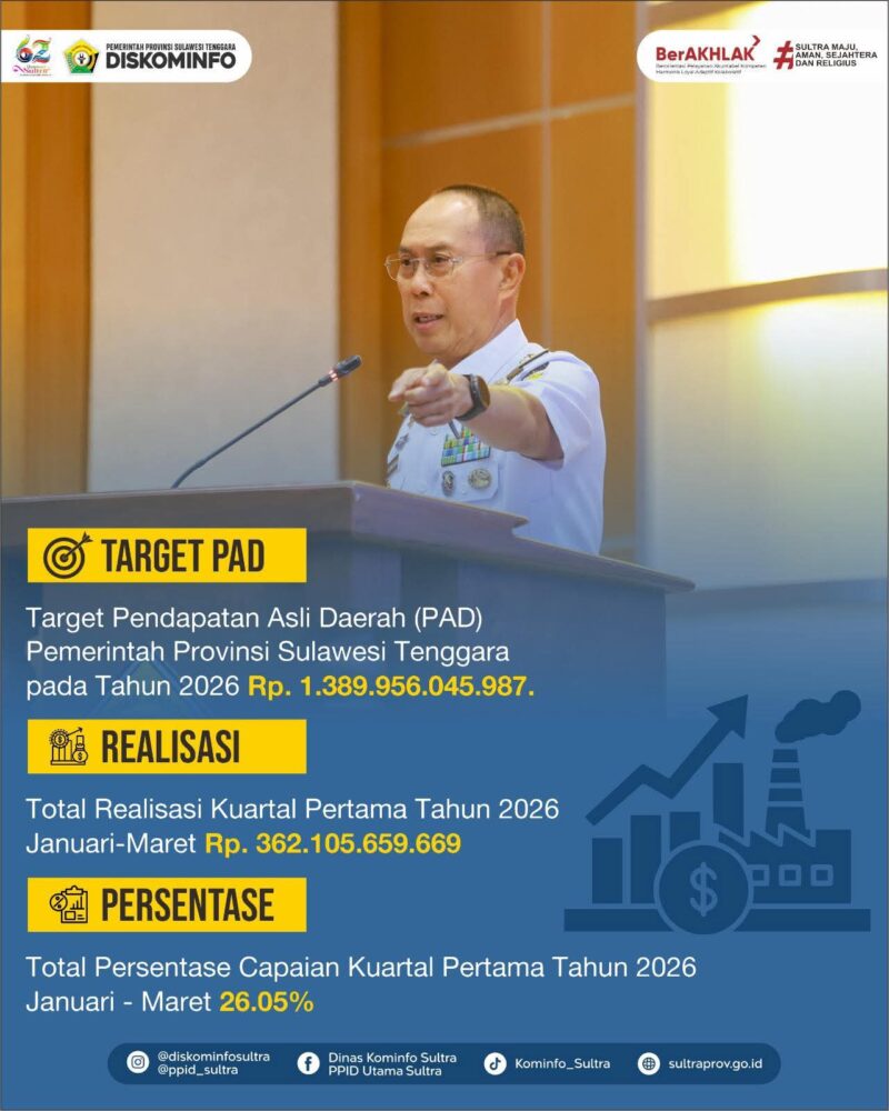Pilarkita.id, Kendari – Pemerintah Provinsi Sulawesi Tenggara mengklaim realisasi Pendapatan Asli Daerah (PAD)  hingga akhir Maret 2026 tercatat mencapai Rp326.470.617.965 atau setara dengan 23,49 persen dari total target tahun 2026 sebesar Rp1,389 triliun.